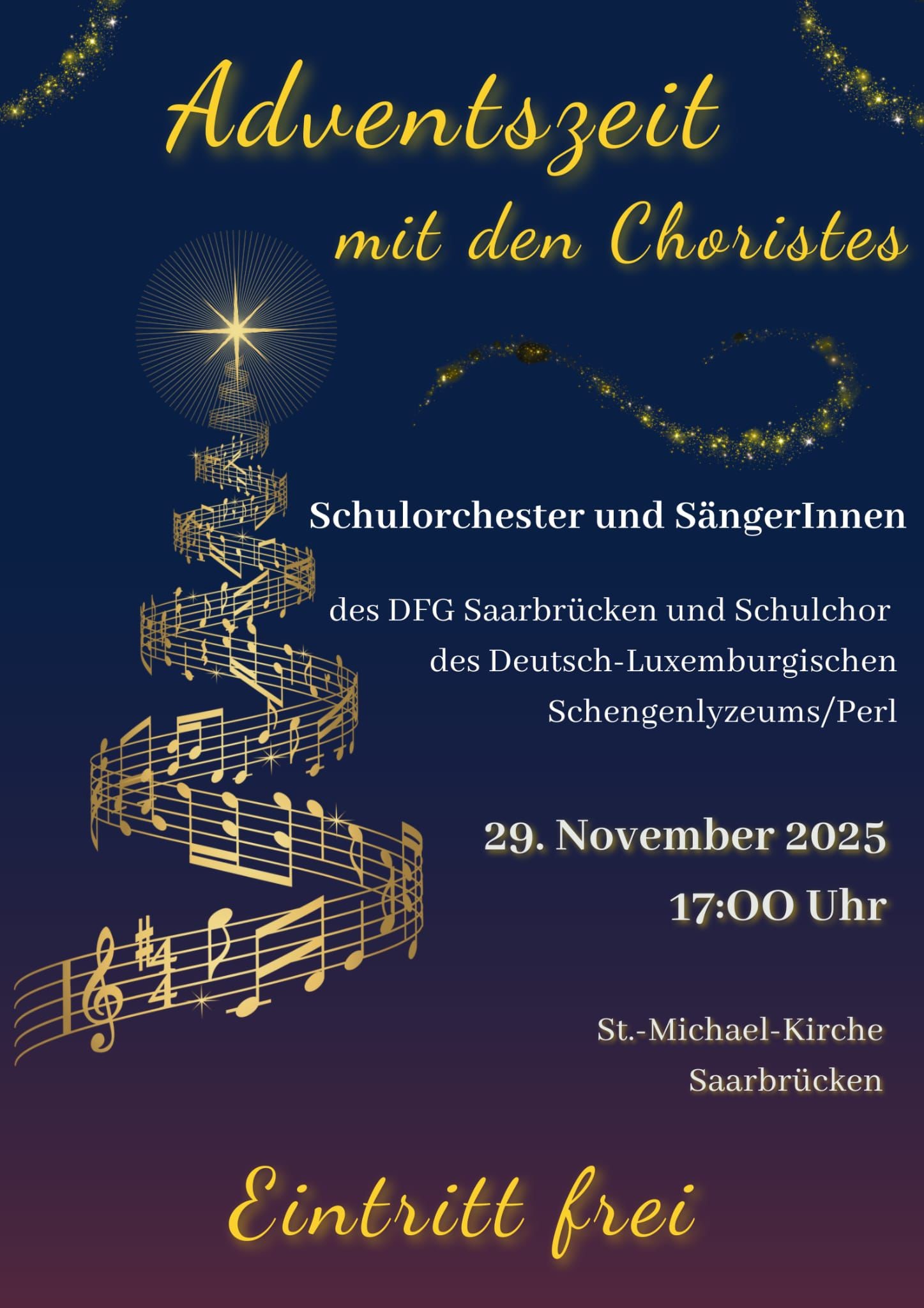 Das Orchester des Deutsch- Französischen Gymnasiums Saarbrücken lädt herzlich zum diesjährigen Adventskonzert ein. Unter dem Motto „Adventszeit mit den Choristes“ gestalten das Schulorchester und die Sänger:innen des DFG Saarbrücken sowie der Schulchor des Deutsch-Luxemburgischen Schengenlyzeums Perl einen festlichen musikalischen Abend. ✨