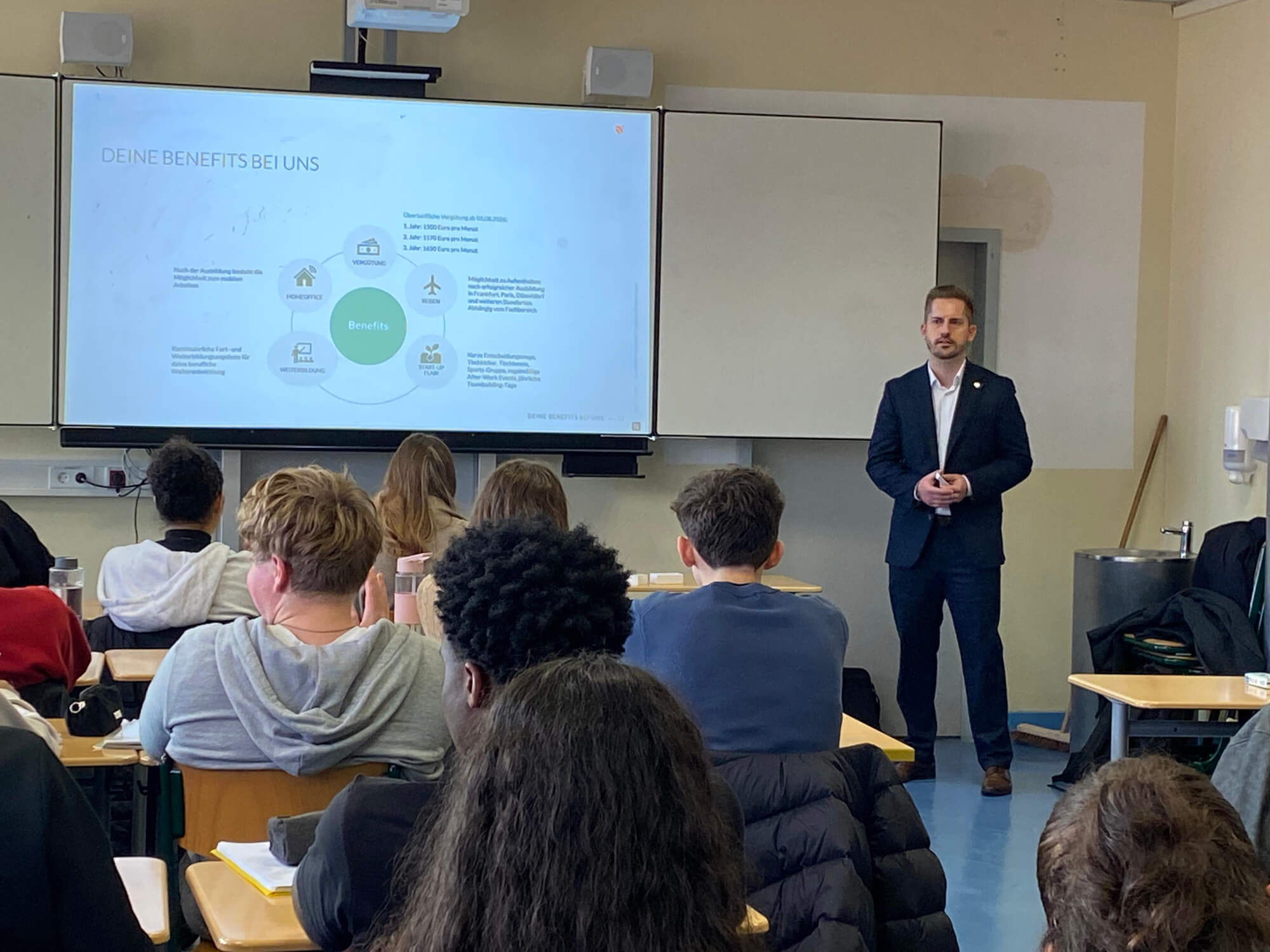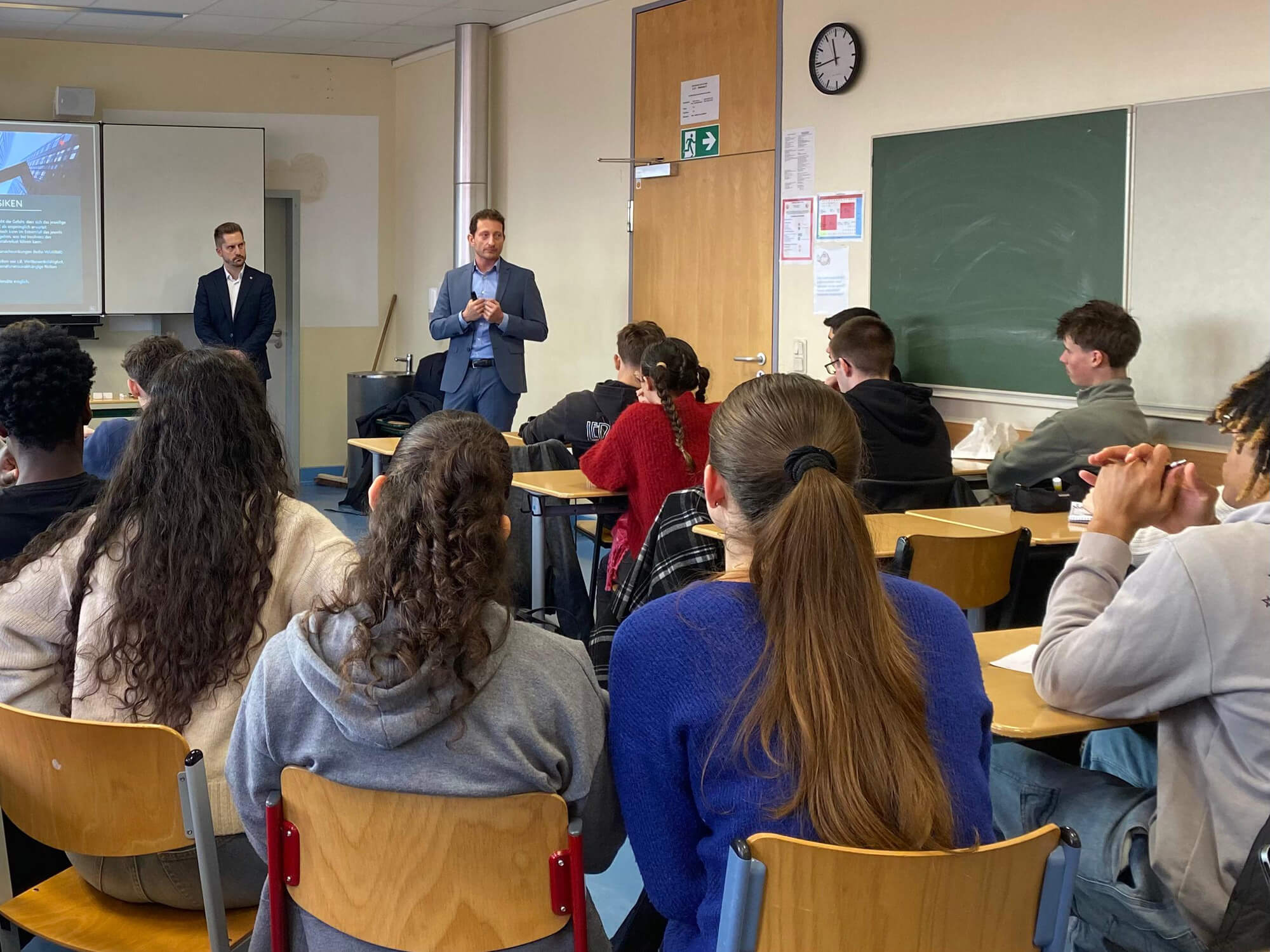 Die beiden Referenten stellten auch die verschiedenen Berufe im Bankensektor sowie die Ausbildungsmöglichkeiten in den Bereichen Bankwesen und Informatik vor. Die Schüler*innen waren sehr aufmerksam und zeigten großes Interesse, indem sie zahlreiche Fragen stellten, wodurch ein reger und anregender Austausch entstand.