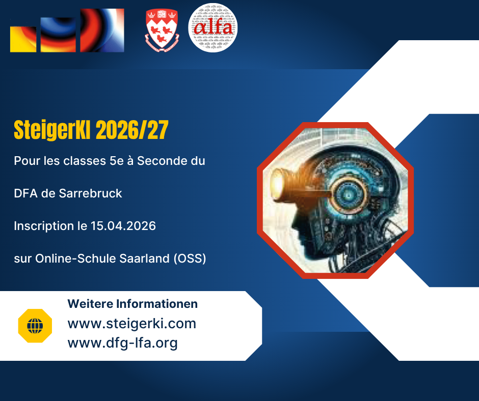 Comment s’inscrire ? – L’inscription débute le 15 avril 2026 et les élèves des classes de 5e jusqu’à la 2nde peuvent y participer. C’est pourquoi vous êtes tous enregistrés sur Online-Schule Saarland (OSS) pour le cours « SteigerKI ». Sur OSS, vous pouvez finaliser votre inscription par rapport à votre niveau de classe et obtenir plus d’informations. Le nombre de participants est limité. Priorité est donnée aux premiers qui s’inscrivent.